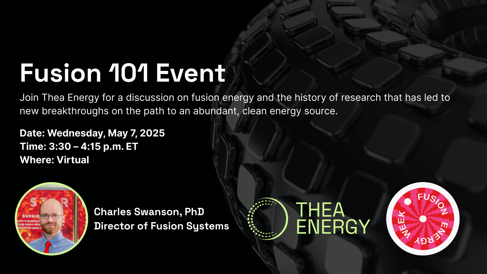 Join Thea Energy and Director of Fusion Systems Charles Swanson, PhD, for a talk on fusion energy, technology approaches, and the history of research that has led to new breakthroughs on the path to an abundant, clean energy source.
